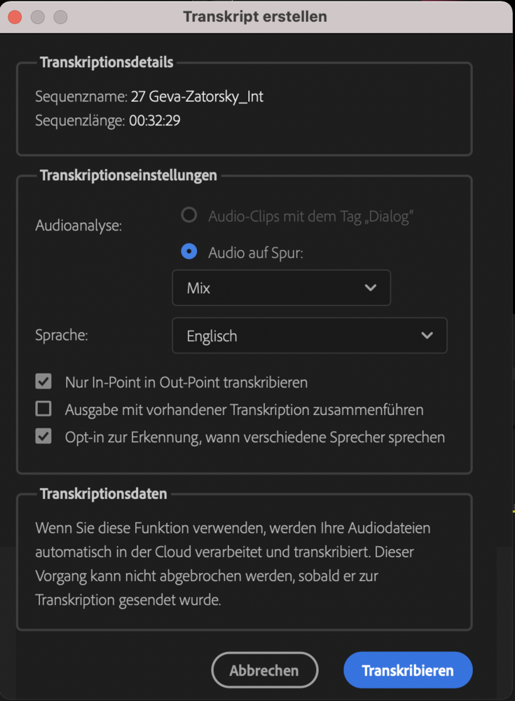 - Sequenz durch Transkript (Premiere) transkribieren lassen