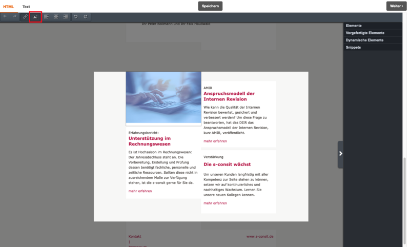 In der rechten Seitenleiste finden sich die Elemente, die im jeweiligen Newsletter zur Verfügung stehen, z. B. Headgrafik, Text, Zwei Teaser, Drei Teaser etc. Die Auswahl an Elementen ist immer vom jeweiligen Design abhängig und variiert stark – bei s-consit gibt es lediglich zwei Elemente, beim Scandinavian Park mehr als 10. Neue Elemente können per Drag and Drop im Newsletter ergänzt werden.