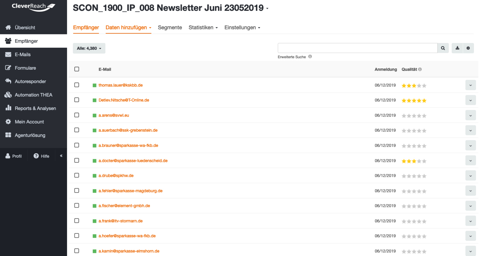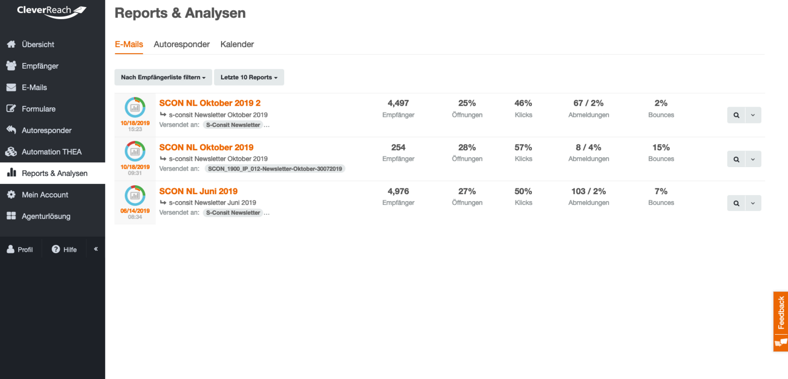 Nach dem Versand kann die aktuelle Auswertung der Öffnungs- und Klickzahlen sowie weiterer Kennzahlen unter „Reports & Analysen eingesehen werden. Wünscht der Kunde eine Auswertung, so schicken wir den Export in PDF-Form an den Projektleiter.