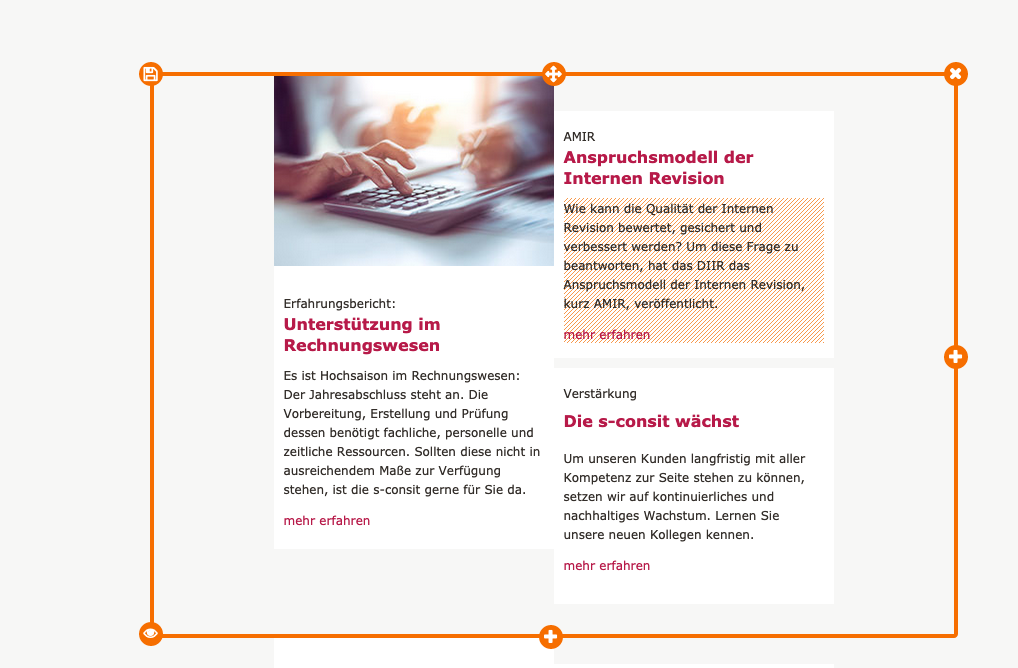 Wenn man mit der Maus über einen Text, eine Headline oder eine Grafik fährt, wird dieser orange schraffiert. Dies bedeutet, der Inhalt kann bearbeitet werden.