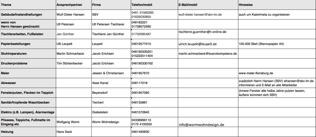 In der Agentur fallen regelmäßig kleine Reparaturen an, die umgehend behoben werden müssen. Hierfür werden die entsprechenden Ansprechpartner angerufen, die in der unten aufgeführten Tabelle gesammelt mit ihren Kontaktdaten aufgeführt sind.