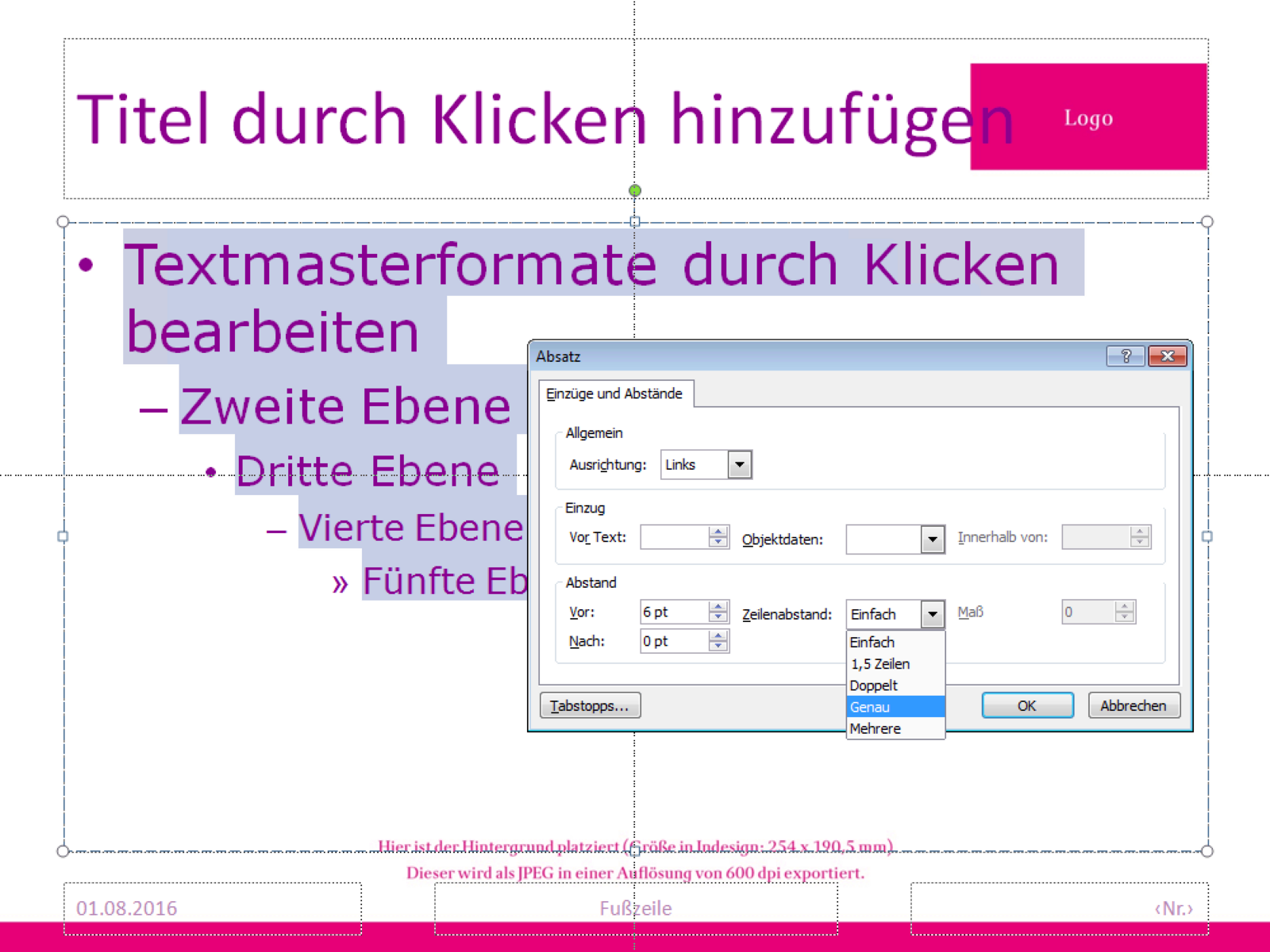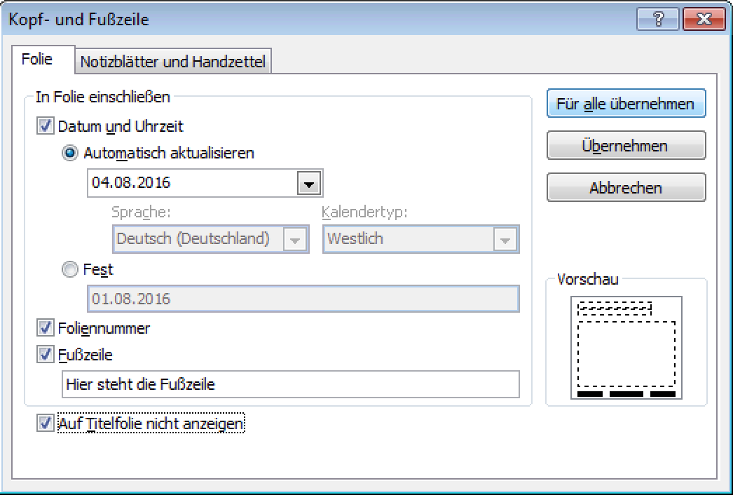 - Hier lassen sich über Folie jetzt die gewünschten Parameter wie Datum und Uhrzeit, Foliennummer und Fußzeile anwählen.