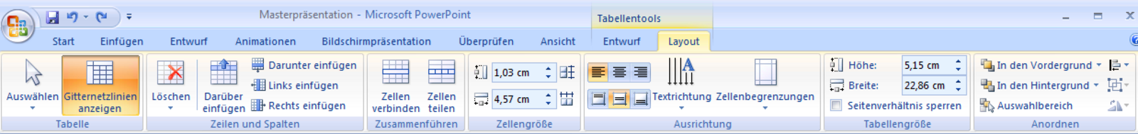- Tabellen lassen sich nicht im Masterlayout definieren. Soll ein Tabellendesign in der Layoutvorlage enthalten sein, so ist es ratsam, in der normalen Präsentation eine Beispieltabelle anzulegen.