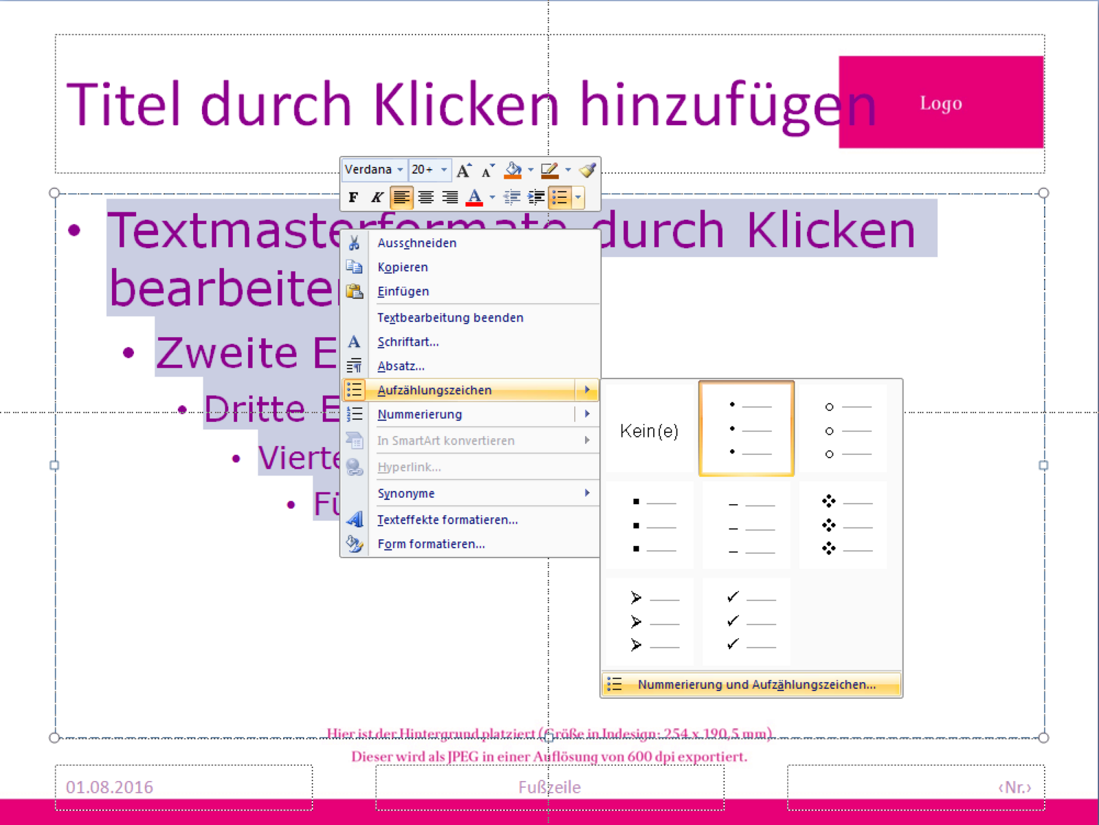 - Über Rechtsklick/Aufzählungszeichen den letzten Punkt im Menü Nummerierung und Aufzählungszeichen anwählen.