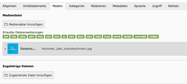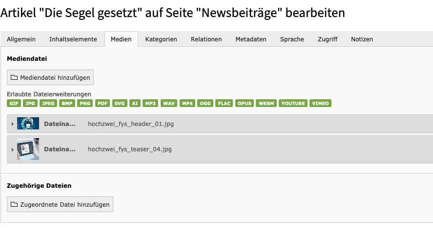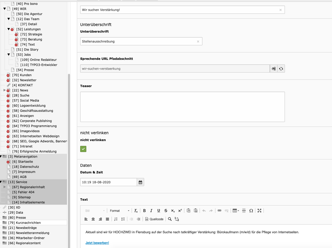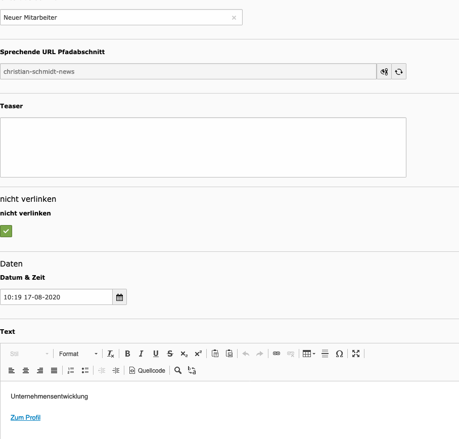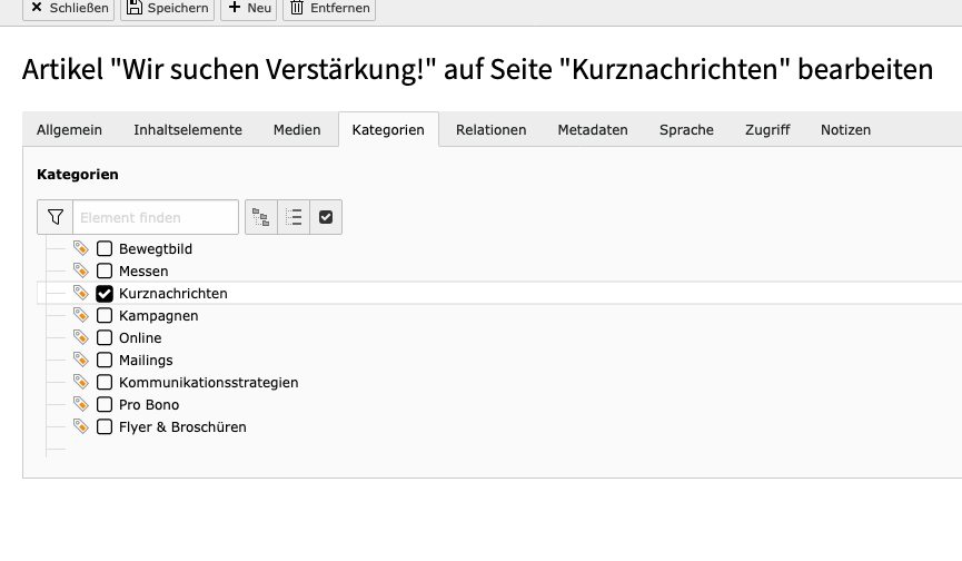 - Ausnahme eigene Pressemitteilung mit eigenem Text: Teaser, Text in Allgemein (kein Haken bei „nicht verlinken“), Teaser-Bild und Headgrafik unter „Medien“ -> Kategorien: Presse und Startseite