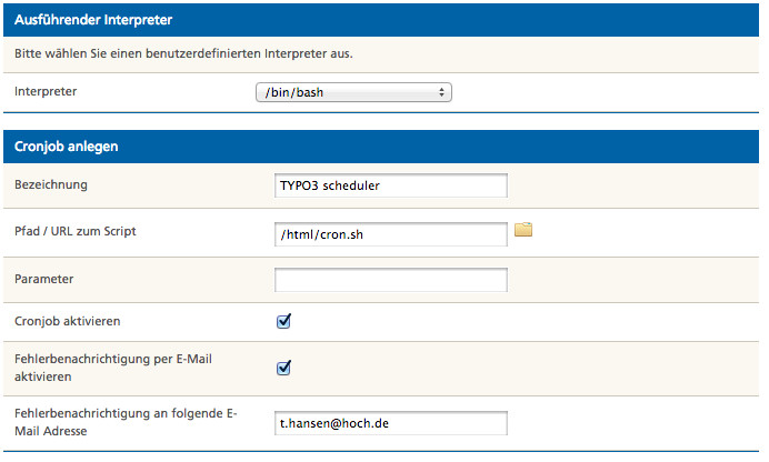 - Unbedingt prüfen, ob das Script funktioniert. Dafür einfach das Script /kunden/homepages/x/xxxxx/htdocs/xxxx/typo3/cli_dispatch.phpsh scheduler auf der Konsole ausführen - in vielen fällen muss der Interpreter (erste Zeile cli_dispatch.phpsh) angepasst werden