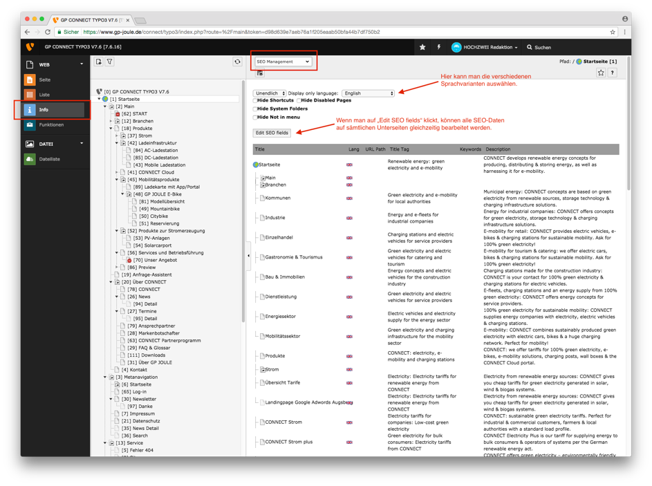 Hierfür muss man zunächst auf „Liste“ und dann „SEO-Management“ gehen. Klickt man nun auf „Edit SEO fields“ kann man alle SEO-Daten der verschiedenen Unterseiten gleichzeitig bearbeiten.