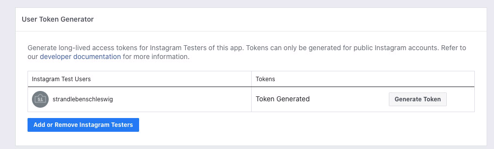 - Zurück zur Facebook App gehen und dann wieder auf "Instagram Basic Display". Dort gibt es nun einen Token Generator. Mit diesem kann das Token generiert werden (Das Token ist für 60 Tage gültig):