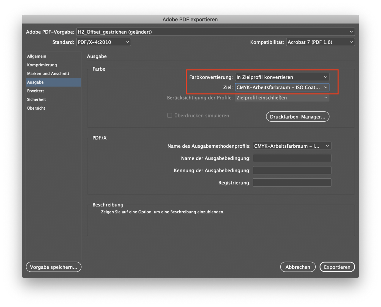- Ausgabe „in Zielprofil konvertieren“ ISO Coated beachten