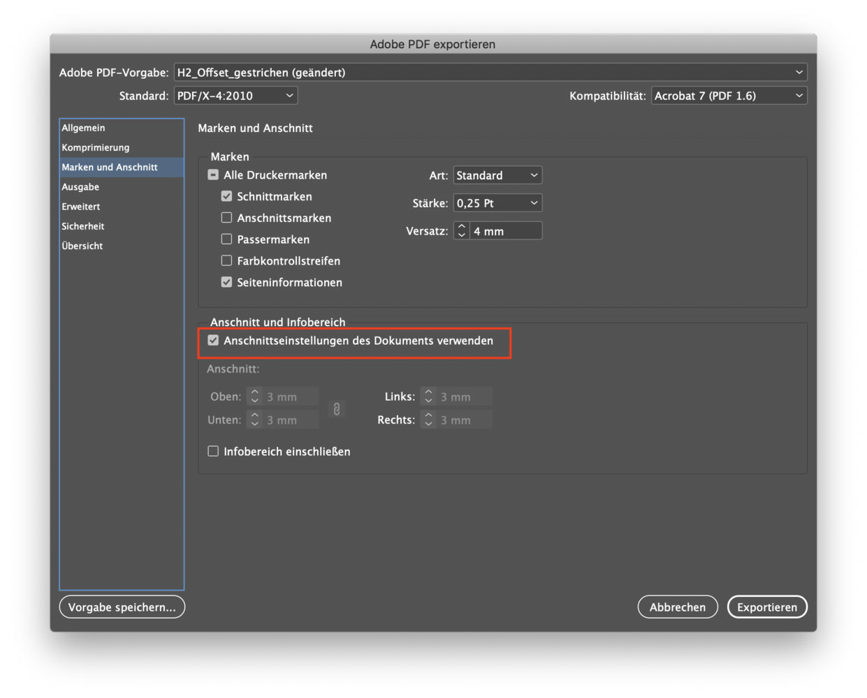 Beim Exportieren der PDF müssen folgende Einstellungen beachtet werden: