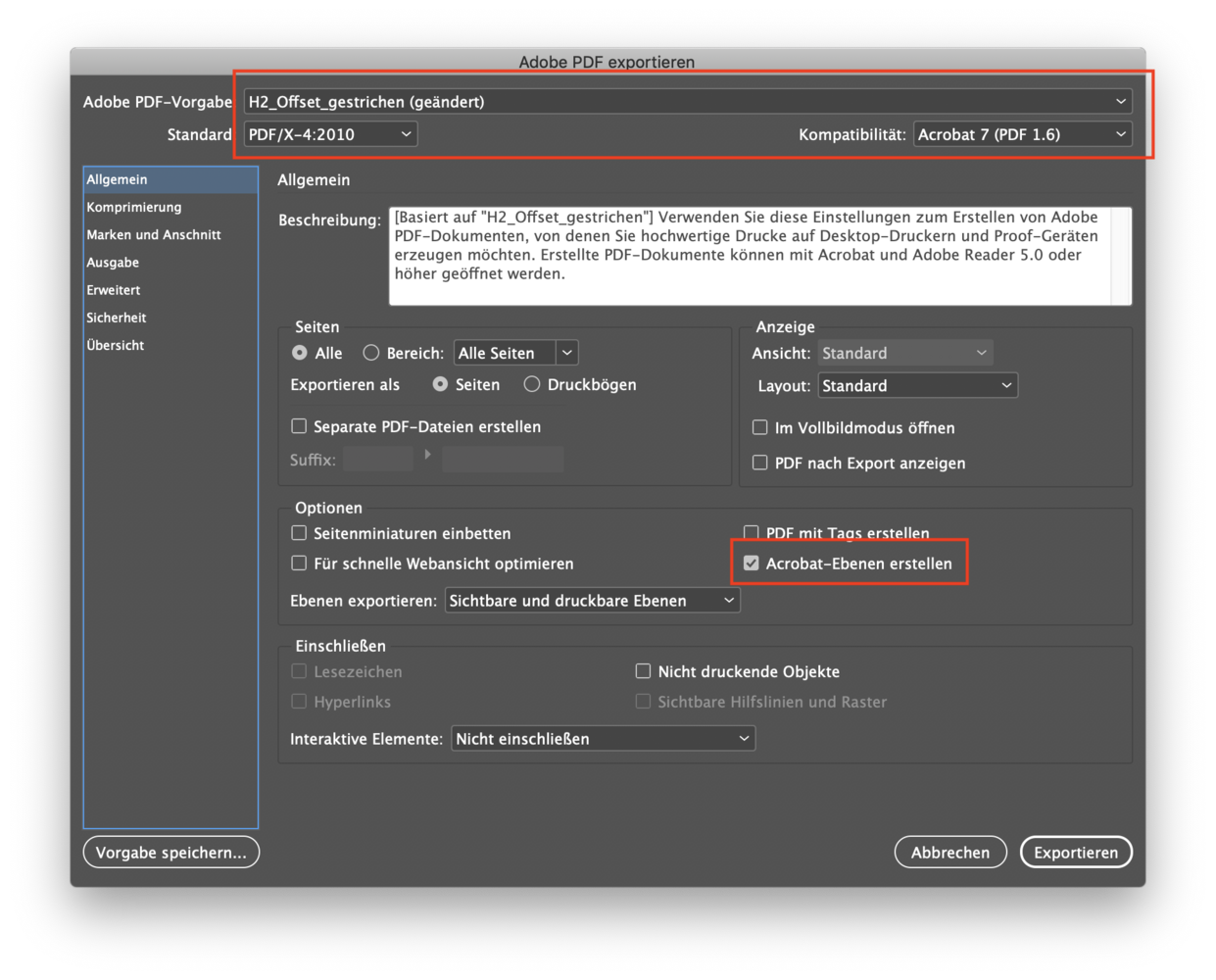- unter Optionen Häkchen bei „Acrobat-Ebenen erstellen“ setzen