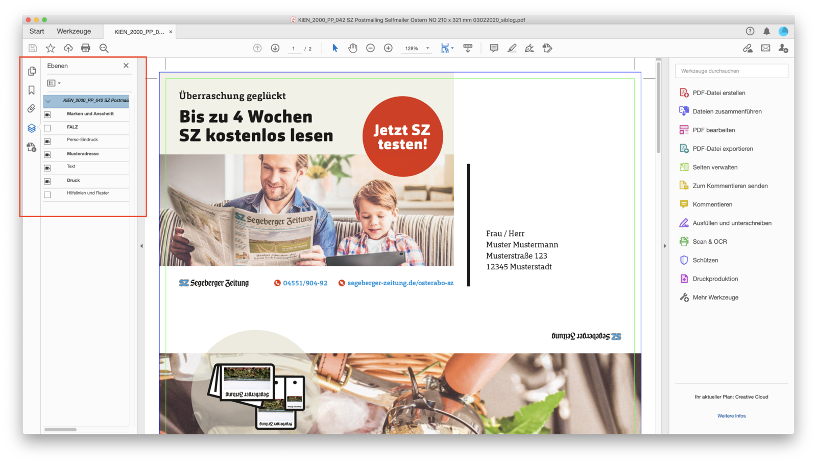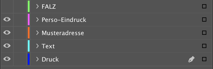 Sobald ein Werbemittel direkt an einen Kunden adressiert wird, müssen in InDesign einzelne Ebenen angelegt werden, die im Nachhinein in der PDF über Acrobat ein- und ausblendbar sind. Es werden immer 4 grundlegende Ebenen angelegt: