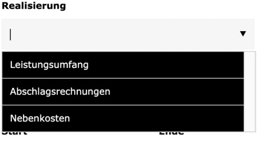 Projekt: Hier kann man ein entsprechendes Projekt auswählen, hat man eins ausgewählt, laden im nächsten Feld (Realisierung), alle Realisierungen, die diesem Projekt zugeordnet sind.