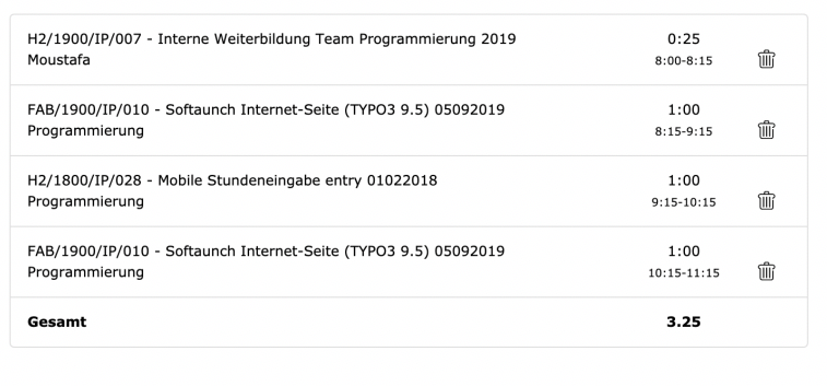 Wichtiger Hinweis: Die Einträge in dieser Liste sind anklickbar, beim Klicken auf einen Eintrag werden alle Daten in die oben aufgeführten Formularfelder entsprechend eingetragen, sodaß man beim gleichen Kunden, Projekt, Realisierung und Leistung schnell seine Zeit eintragen kann.