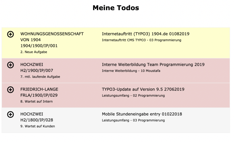 Auf dieser Seite sieht man seine eigenen Aufgaben farblich markiert je nach Status.