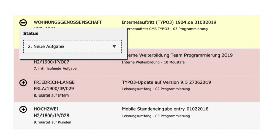 Hier kann ein Projektleiter einen Mitarbeiter wählen und den Status eines Jobs bzw. eines Projekts ändern sowie den Job einem anderen Mitarbeiter zuweisen.