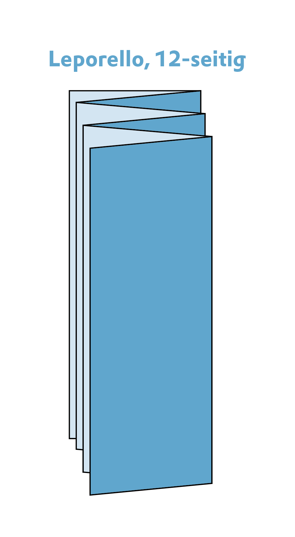 Der bei uns gängiste Parallelfalz ist der DIN-lang-Folder, ein 6-Seiter mit Parallelbrüchen, gewickelt oder im Zickzack. Ausgehend vom DIN A4 Format (297 x 210 mm) ergibt sich ein Endformat von 100 x 210 mm. eine der äußeren Seiten muss verkürzt angelegt werden, s. Skizze.