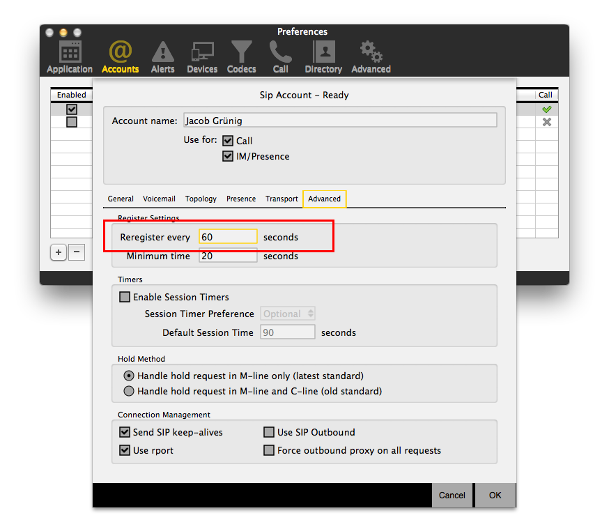 Bria muss sich häufiger beim SIP-Server melden, dass es noch da ist.