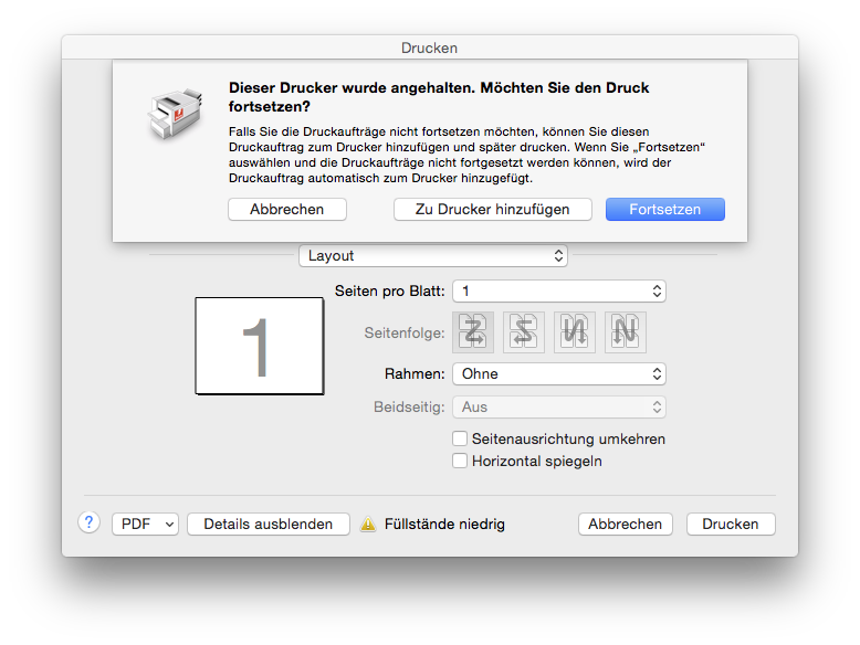 Beim Versuch zu drucken erscheint die Meldung "Dieser Drucker wurde angehalten". Beim Klick auf Fortsetzen verlangt der Rechner den Login eines Users der Gruppe Print Operators.