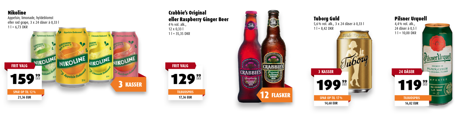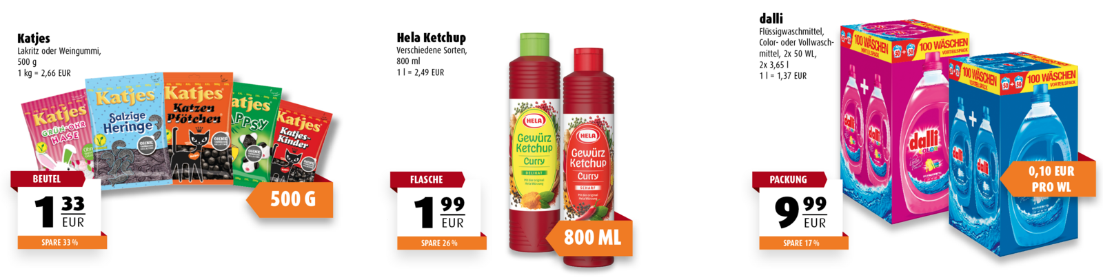 Reihenfolge (wie auch in der Liste) ist: Titelseite (in der Liste mit „Seite 1”) markiert, Bier, Getränke, Spirituosen, Weine (nach Ländern sortiert), Süßwaren, Lebensmittel und Kosmetik/Nonfood – jeweils Doppelseiten (ein Blick in den letzen gedruckten Prospekt verschafft einen Überblick).