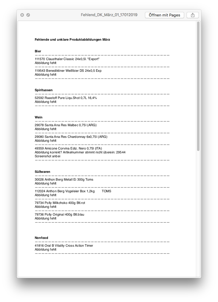 Erfahrungsgemäß kommen fast täglich mehrere Updates der Liste, die weitere Produkte enthalten oder Änderungen. Diese werden über den Tag eingepflegt und jeweils zu Feierabend geht ein neuer Stand über den PL an den Kunden.