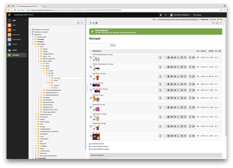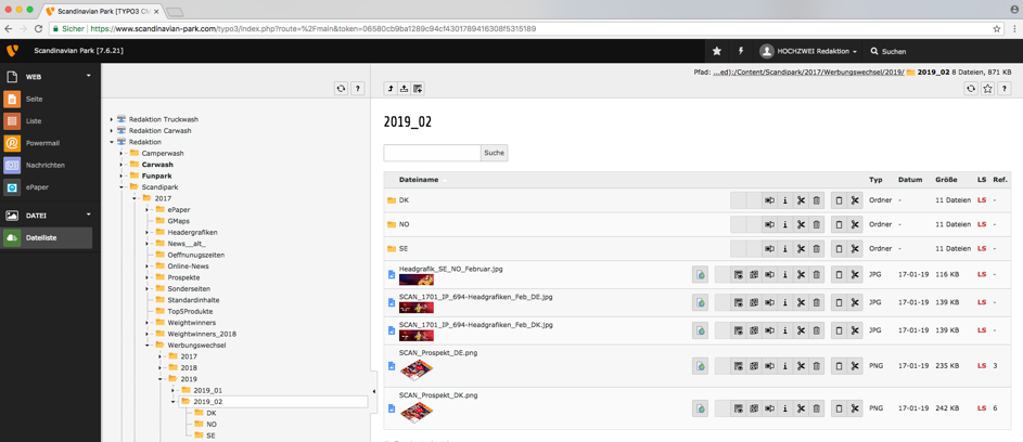 Für alle drei Bereiche werden Grafiken zur Verfügung gestellt. Im ersten Schritt legen wir im Ordner Werbungswechsel -> 2020 einen neuen Monatsordner mit drei Unterordnern (DK, NO, SE) in der Dateiliste an. Auf die erste Ebene legen wir die Prospektgrafiken DE und DK sowie die Headgrafiken DE, DK und NO/SE.