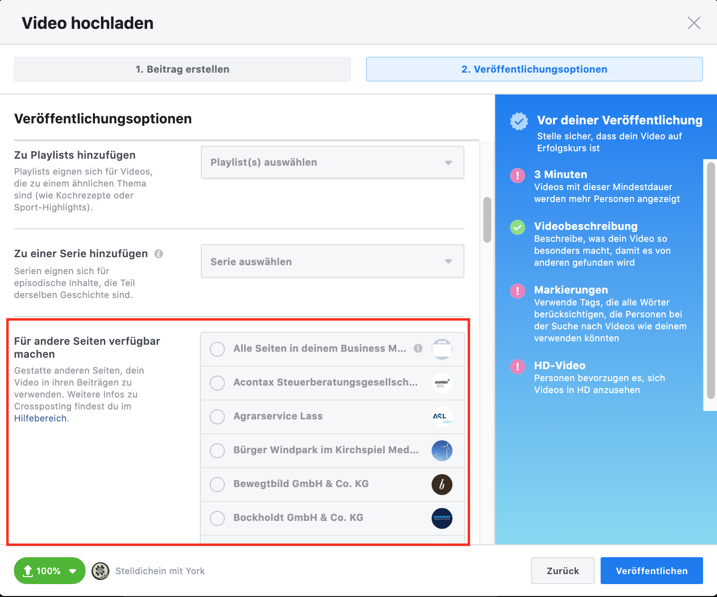 - Facebook: Pro Kunde 1 x Teaser-Clip (Format: 16:9) und 1 x Langfilm (Format: 16:9) inkl. Textvarianten für den Kunden (Crosspostings). Darüber hinaus kommen unregelmäßig Füller-Postings hinzu (Snippets mit York etc.).